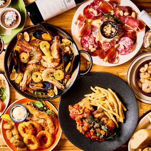 包含一盘意大利熏火腿和三道开胃菜、一份迷你沙拉、时令蒜香蒜酱和法棍面包、伊比利亚猪肩肉铁板烧、西班牙海鲜饭或菲德瓦(意式海鲜饭)、甜点,以及一杯您选择的咖啡或茶!您还可以选择啤酒、起泡酒、桑格利亚汽酒和鸡尾酒等酒精饮料。